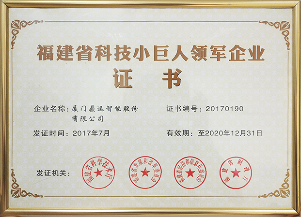 廈門鼎運智能成功列入省科技小巨人領(lǐng)軍企業(yè)培育發(fā)展庫,并榮獲“福建省科技小巨人領(lǐng)軍企業(yè)”證書。