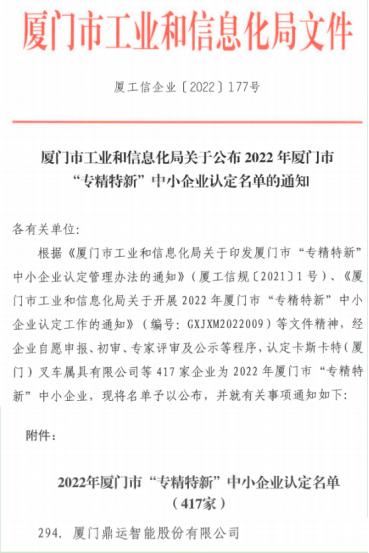 鼎運(yùn)智能榮獲廈門(mén)市“專(zhuān)精特新”中小企業(yè)稱(chēng)號(hào)