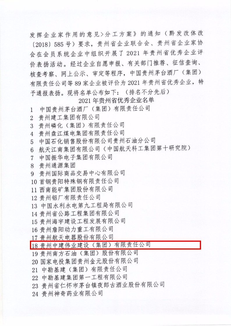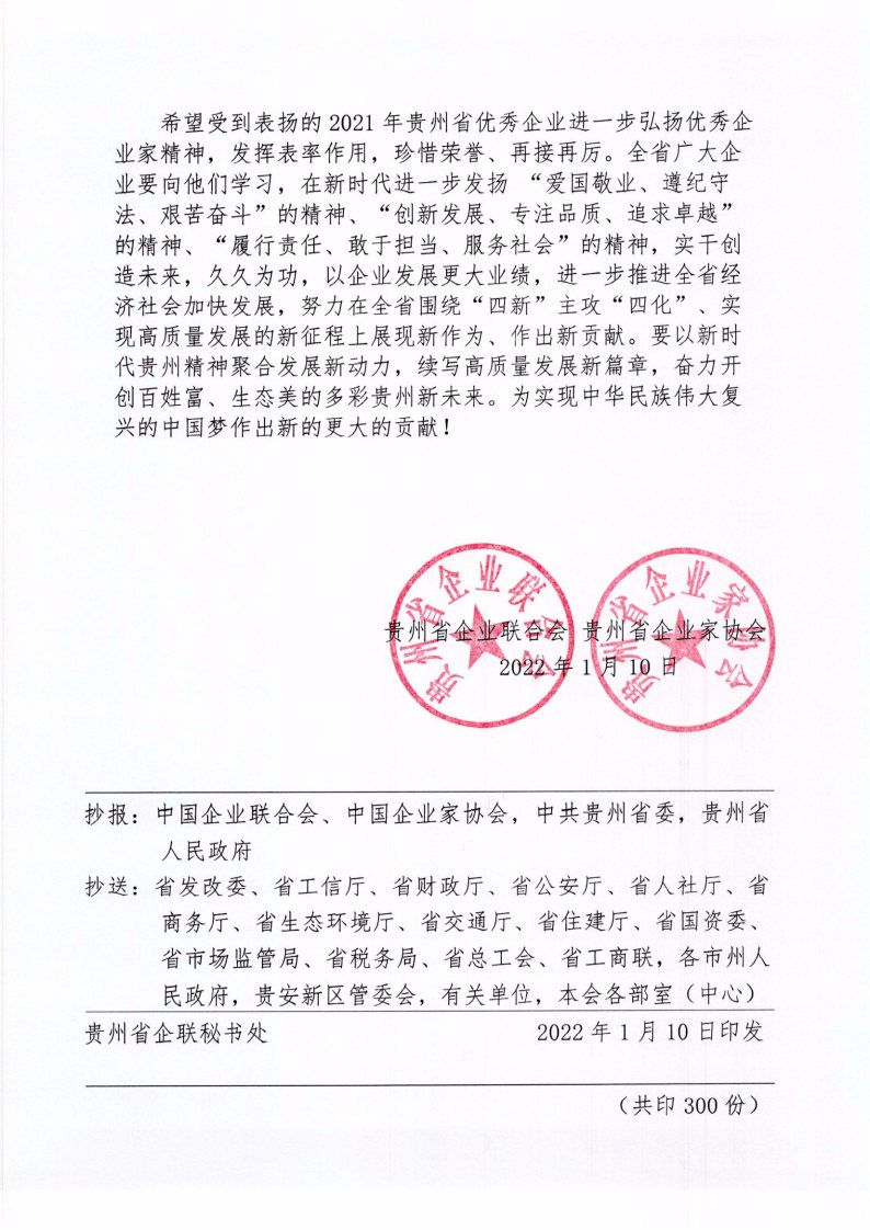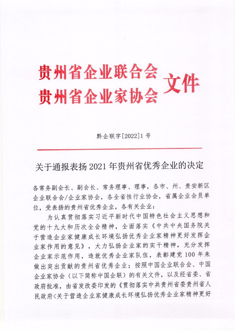 2022年1月10日,貴州省企業(yè)聯(lián)合會(huì)、貴州省企業(yè)家協(xié)會(huì)印發(fā)《關(guān)于通報(bào)表?yè)P(yáng)2021年貴州省優(yōu)秀企業(yè)的決定》,集團(tuán)公司被授予“貴州省優(yōu)秀企業(yè)”榮譽(yù)稱號(hào)。