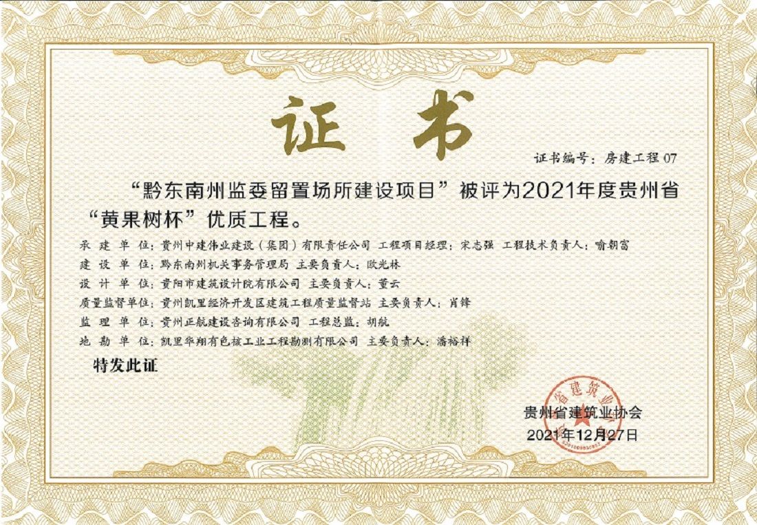 近日,從貴州省住房和城鄉(xiāng)建設(shè)廳傳來喜訊,公司承建的“黔東南州監(jiān)委留置場所建設(shè)項(xiàng)目”榮獲2021年度貴州省“黃果樹杯”優(yōu)質(zhì)工程獎。