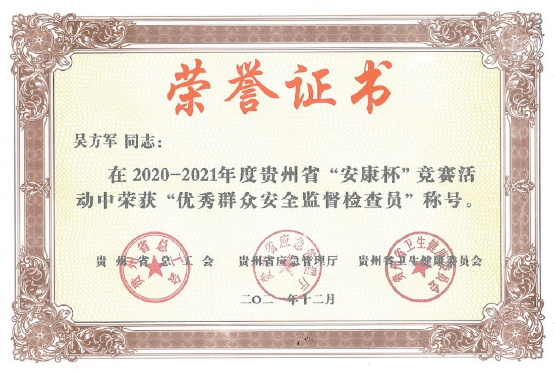 同時,集團(tuán)公司吳方軍同志在該次評選中榮獲“貴州省優(yōu)秀群眾安全監(jiān)督檢查員”稱號。