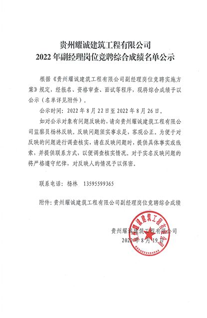 貴州耀誠建筑工程有限公司副經(jīng)理崗位競聘綜合成績公示