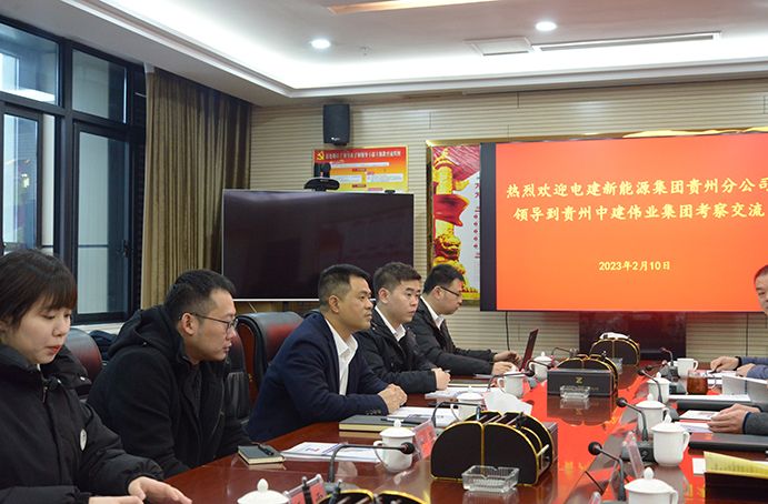 為深化黔東南州新能源資源的合作開發(fā)利用,2023年2月10日,央企中電建新能源集團(tuán)貴州分公司副經(jīng)理鐘輝一行赴中建偉業(yè)集團(tuán)公司考察交流,達(dá)成初步合作意向。貴州中建偉業(yè)集團(tuán)公司黨委副書記、總經(jīng)理馮安翔在集團(tuán)公司17樓會議室熱情接待并主持座談,黨委委員、副總經(jīng)理王引明、王振田,董事長助理張政雄、總經(jīng)理助理田應(yīng)欽、經(jīng)營部經(jīng)理王劍和參加座談。