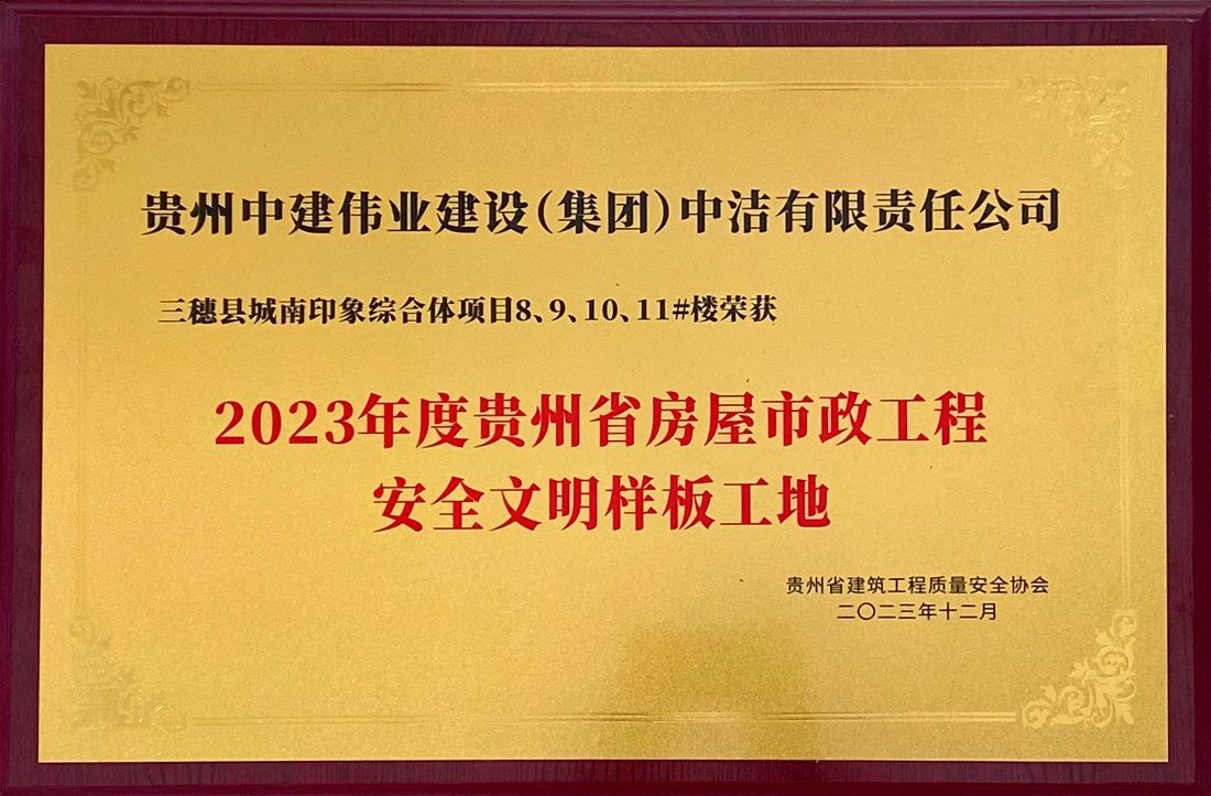 近日,由貴州中建偉業(yè)建設(shè)(集團(tuán))中潔有限責(zé)任公司承建的三穗縣城南印象綜合體項(xiàng)目8#9#10#11#樓,被貴州省建筑工程質(zhì)量安全協(xié)會(huì)評(píng)為“2023年度貴州省房屋市政工程安全文明樣板工地”;三穗縣城南印象綜合體項(xiàng)目8#樓被評(píng)為“2023年度貴州省建筑工程優(yōu)質(zhì)質(zhì)量結(jié)構(gòu)工程”。